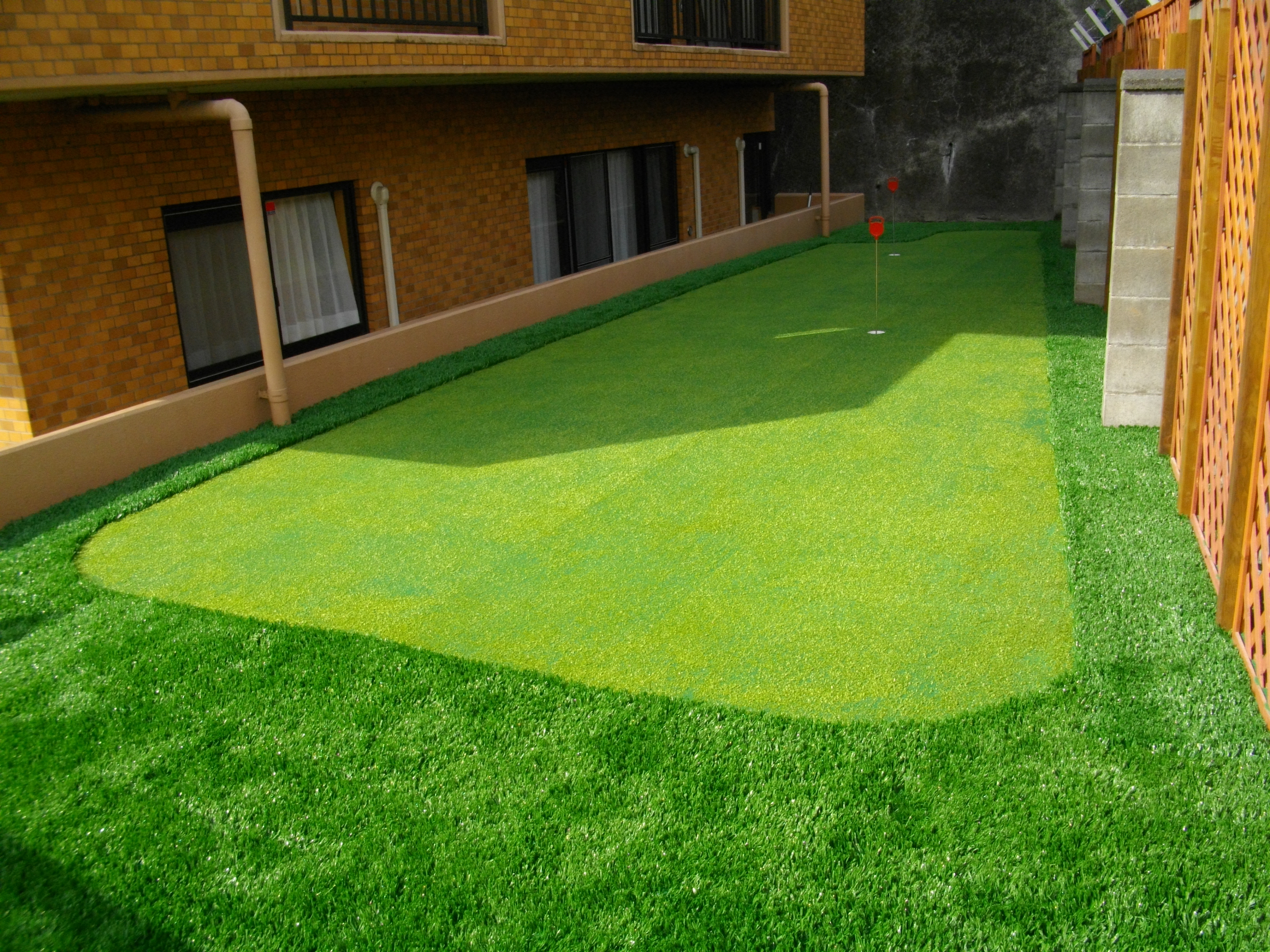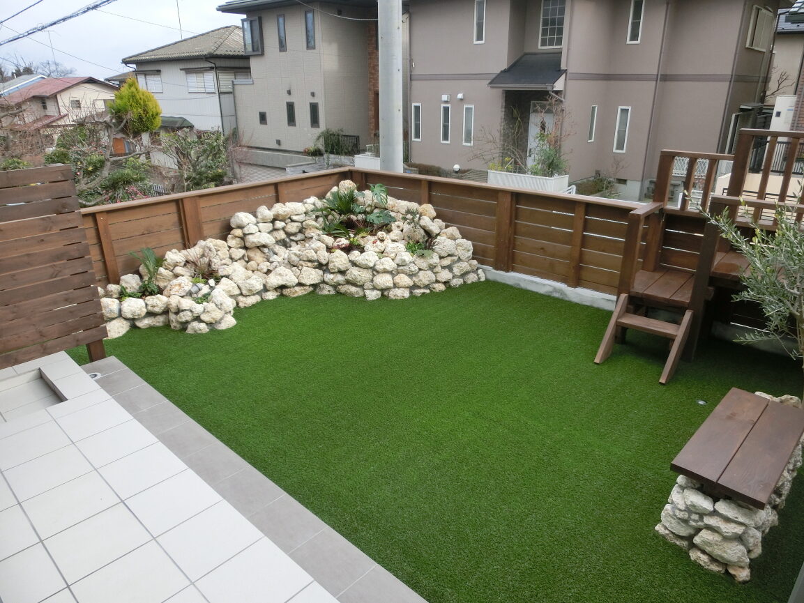 タイルを引き詰めて庭園を作成 人工芝と琉球石灰岩で花壇の作成 お庭の練習用パッティンググリーンとアプローチ ウッドデッキ・ステップ・人工芝の設置 パッティンググリーンの設置 ロックガーデンの作成 玄関前にお庭を作成 人工芝+枕木を使用 天然芝とタイルを使用して庭園を作成 天然竹で四つ目垣・建仁寺垣・木戸を作成 ルーフバルコニーに庭園を作成 人工芝の設置